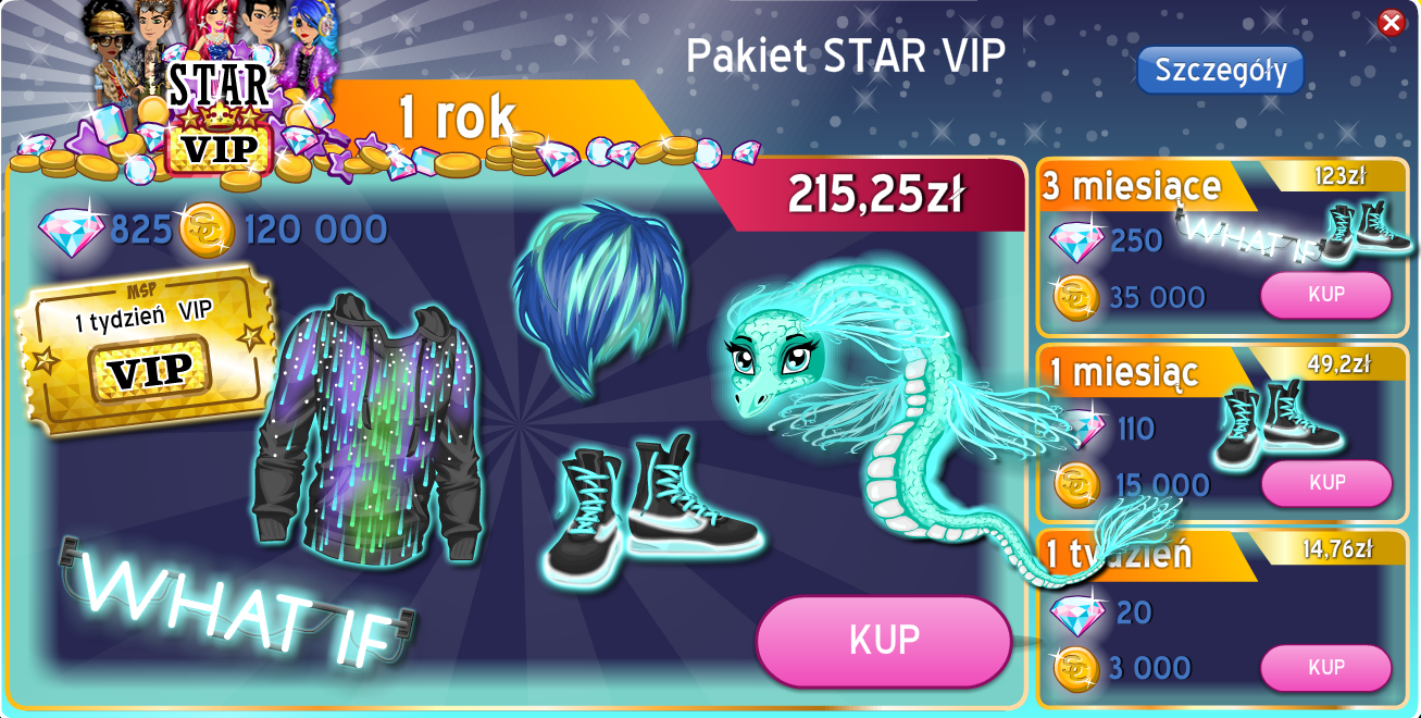 VIP miałam kilka razy - aż 35 dni. Ja bardzo rzadko kupuję VIP'y, głównie jak jest jakaś promocja. Miałam 4 razy STAR VIP na tydzień i raz VIP zwykły na tydzień.
